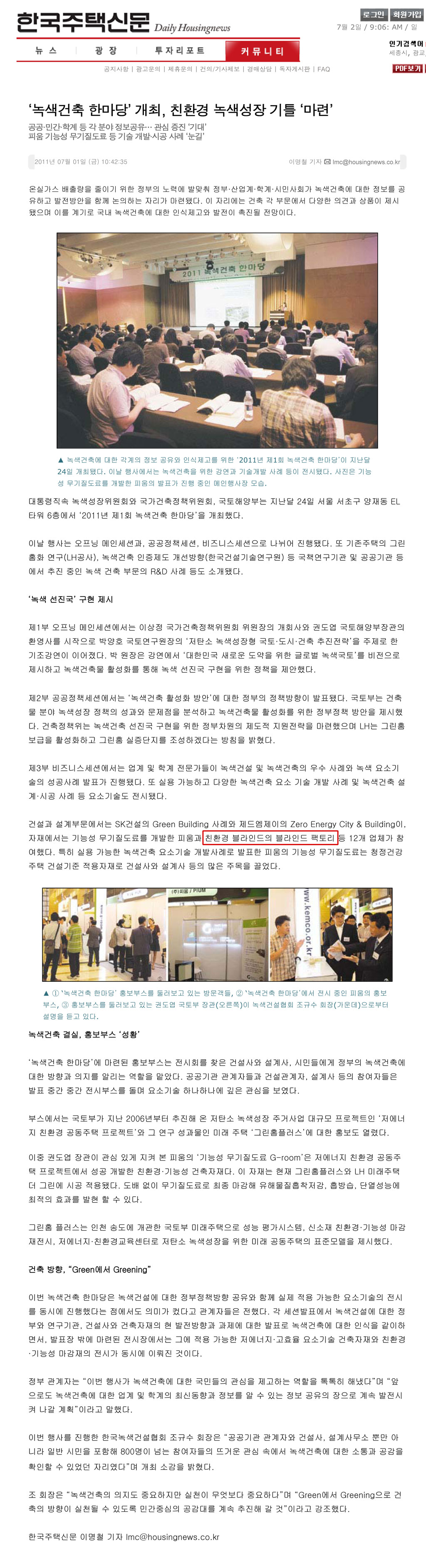 2011³â 7¿ù 1ÀÏ Çѱ¹ÁÖÅýŹ®¿¡ 2011³â 6¿ù 24ÀÏ ¾çÀ絿 ELŸ¿ö¿¡¼ °³ÃֵǾú´ø ³ì»ö°ÇÃàÇѸ¶´ç °ü·Ã ±â»ç°¡ °ÔÀçµÇ¾ú½À´Ï´Ù. ¿©±â¿¡ ºí¶óÀεåÆÑÅ丮°¡ Â÷¾çºÎºÐ¿¡ ÃÊ´ëµÇ¾î Âü°¡ÇÏ¿´½À´Ï´Ù. [ÀÌ °Ô½Ã¹°Àº °ü¸®ÀÚ´Ô¿¡ ÀÇÇØ 2011-11-18 19:04:32 ºí¶óÀεåÆÑÅ丮 ¼Ò½Ä¿¡¼ º¹»ç µÊ]